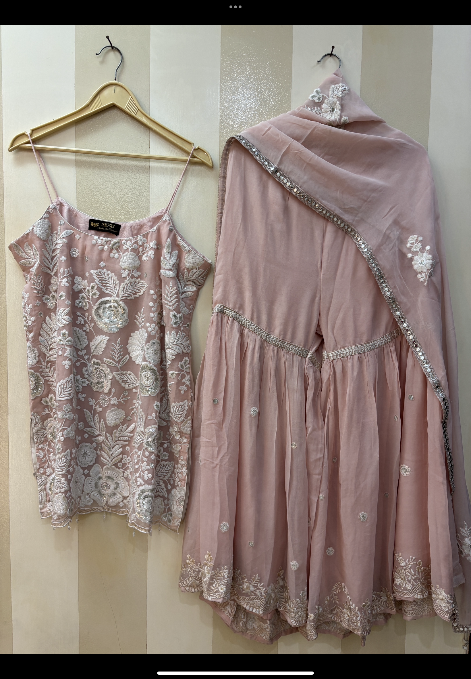 This dreamy baby pink outfit is a must-have for every young girl’s festive or wedding wardrobe! Featuring a noodle strap kurti, this look is all about effortless elegance and modern charm. The top is adorned with intricate hand-embroidered thread work in a floral pattern that gives it a delicate, ethereal feel — light, breezy, and beautifully detailed.